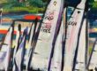 In the paintings, the color and representation of aspects of the race course show sailboats going around marks in various parts of the starts, reaches, upwinds, and downwinds. Mark-making and the use of bright colors emphasize the wind and energy in each piece.